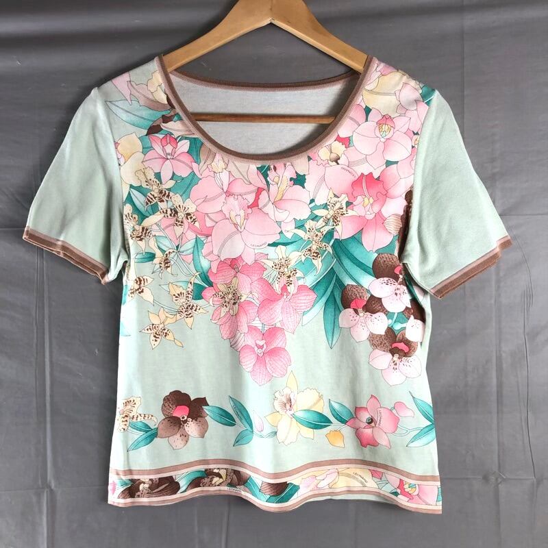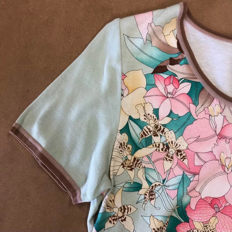 レオナール LEONARD カットソー 半袖 ロゴプリント 花柄 コットン100% 日本製 グリーン系 LLサイズ 801297