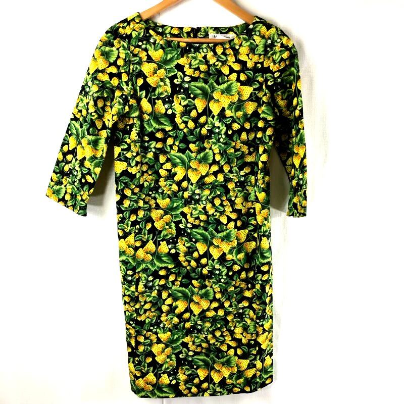 ジュンコシマダ JUNKO SHIMADA ワンピース いちご柄 ボートネック 裏地付き フロントポケット付き ブラック系 38サイズ 838913