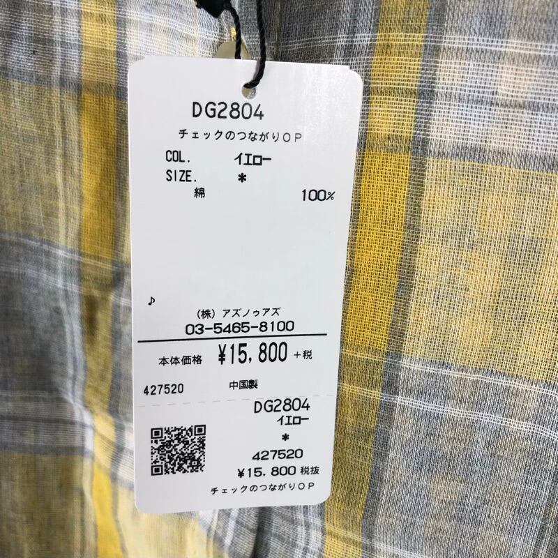 アズノゥアズドゥバズ as know as de base シャツワンピース チェック 綿100% イエロー タグ付き サイズ表記なし 873204