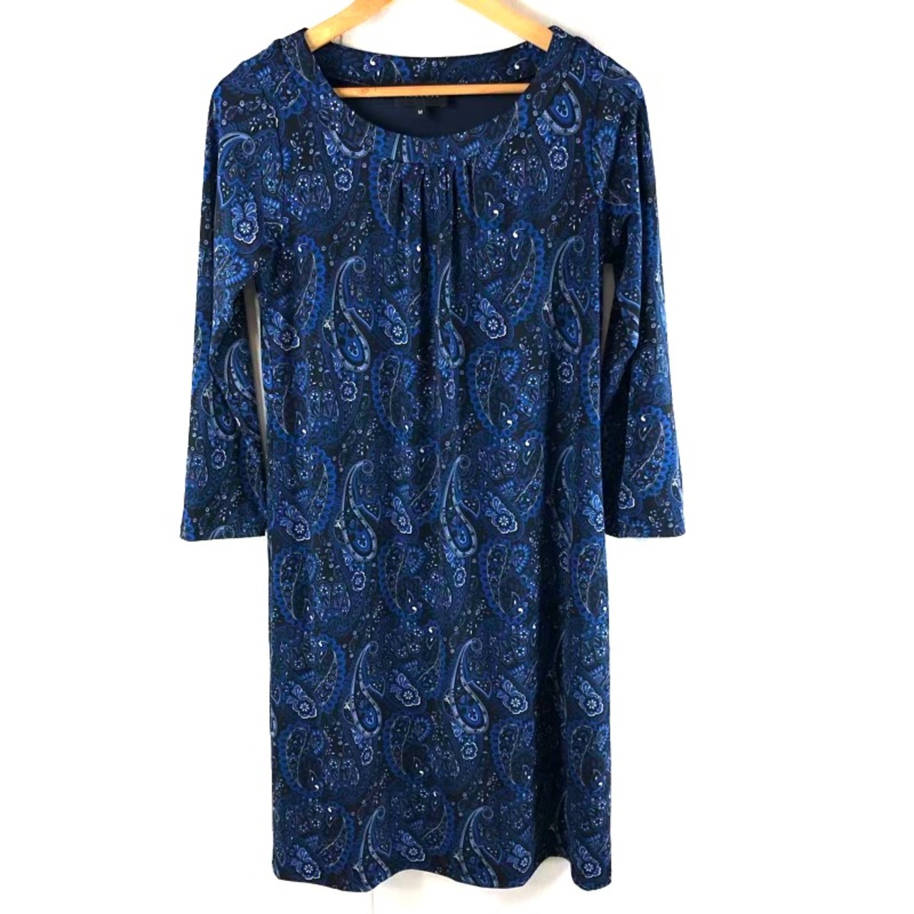 タルボット TALBOTS ワンピース 長袖 裏地付き エスニック柄 薄手 青系 Mサイズ 885992