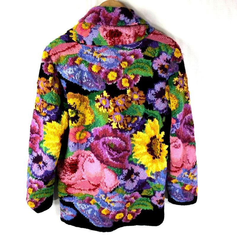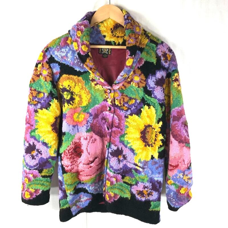 ロイヤルアーデン ROYAL ARDEN ジャケット ニット 裏地付き サイドポケット 花柄 アルパカ100% 黒黄紫 Mサイズ 904872