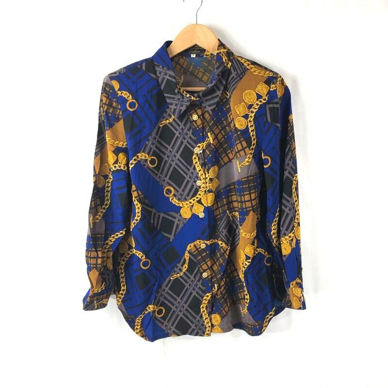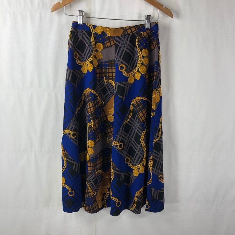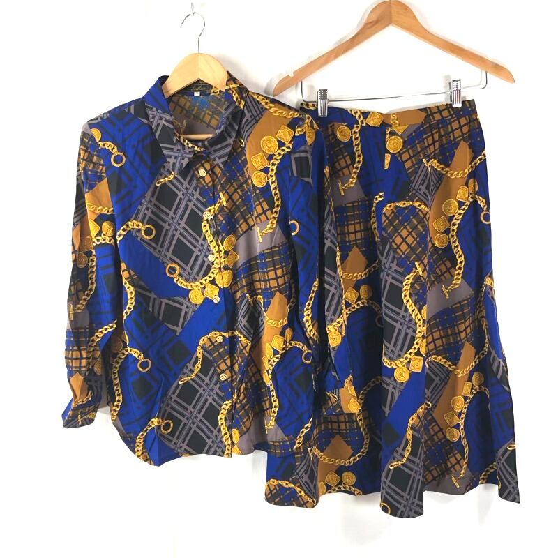 レリアン Leilian セットアップ ロングスカート 薄手 金ボタン 肩パッド 柄模様 長袖 青系 9サイズ 918156