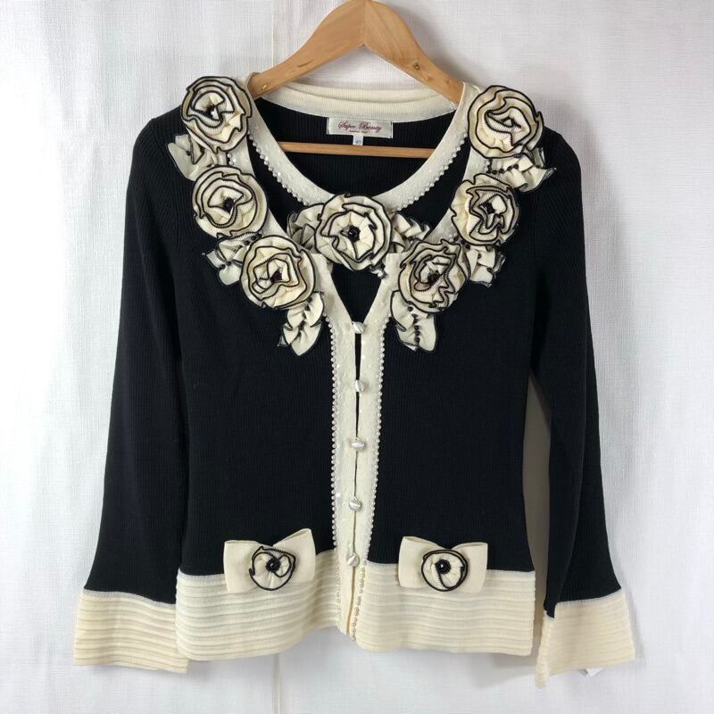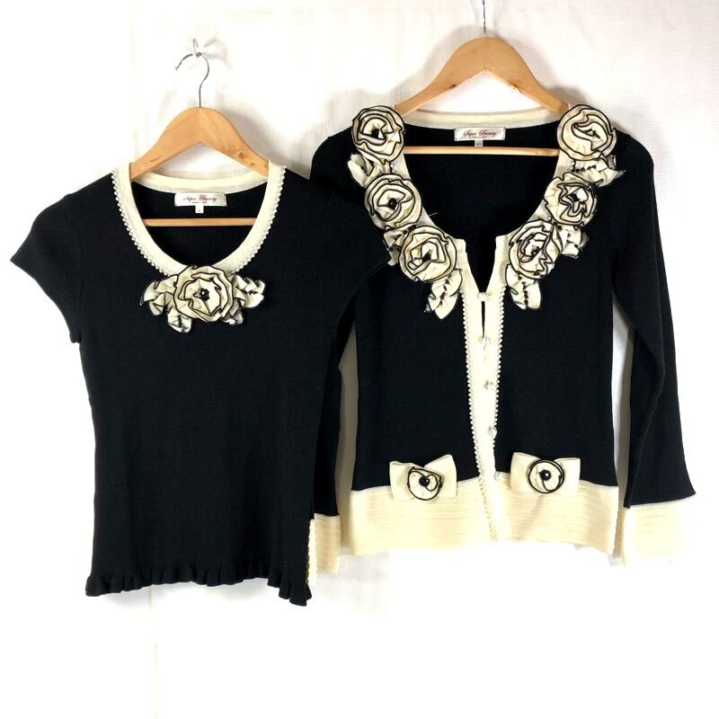 スーパービューティ Super Beauty ニット カーディガン セット アンサンブル スパンコール ビーズ 花飾り 白 黒 40サイズ 924542