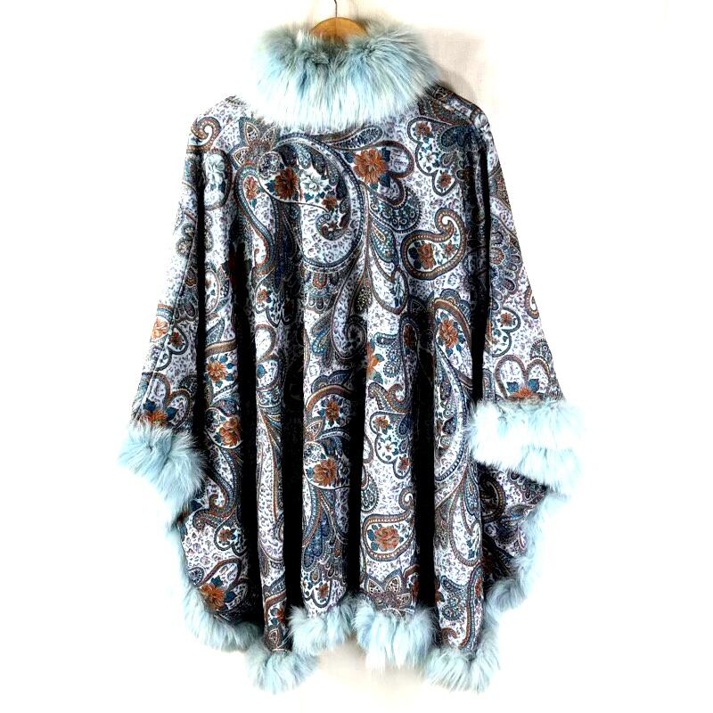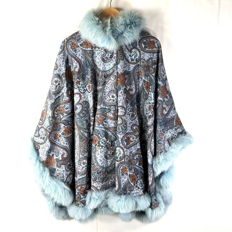 エーシーバング A.C.BANG ポンチョ ファー付 エスニック柄 サイドポケット 前ボタン 水色 927087