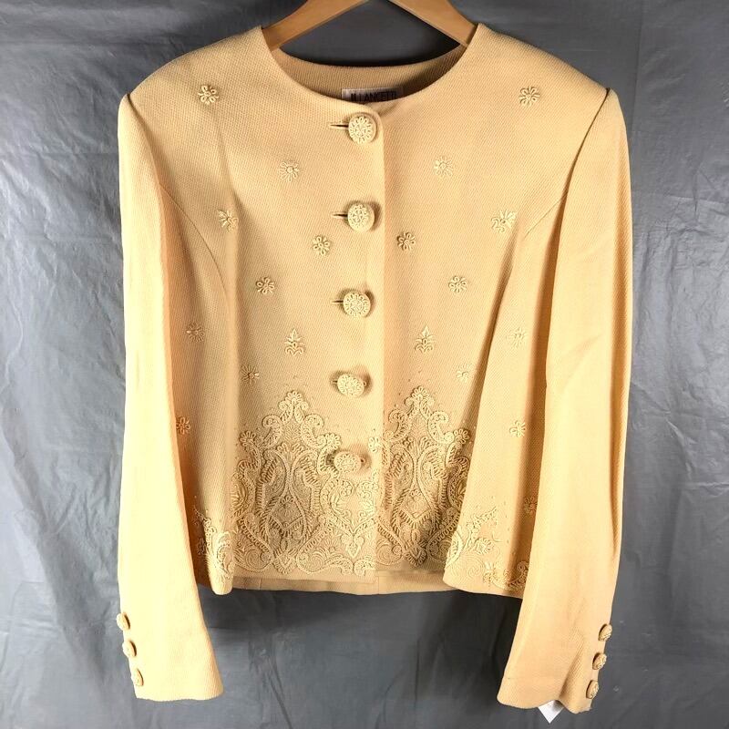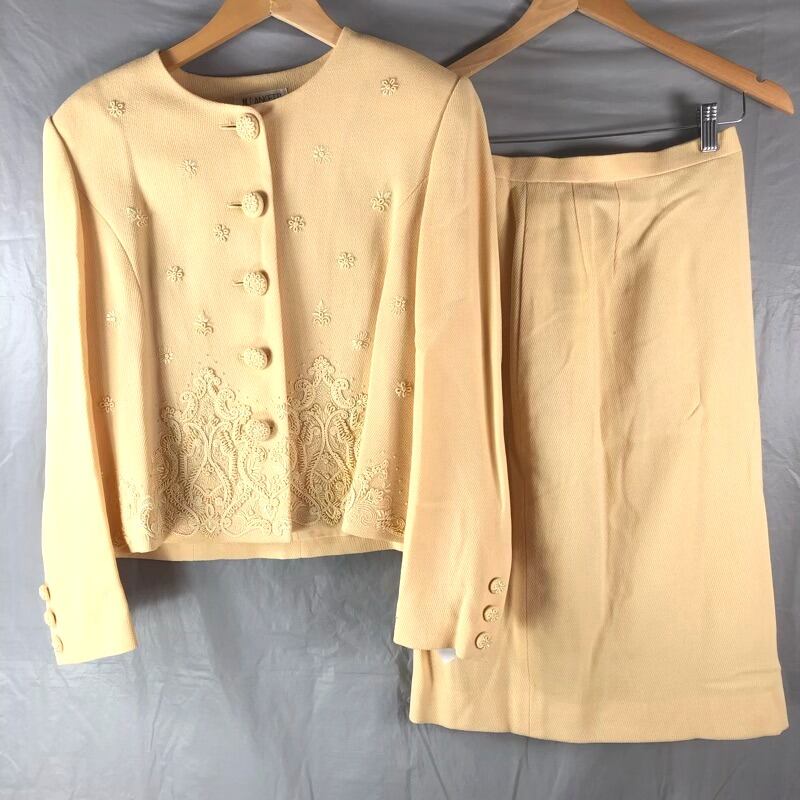 ランチェッティ LANCETTI セットアップ ジャケット スカート 飾りボタン 肩パット 花刺繍 スリット イエロー 40サイズ 932638