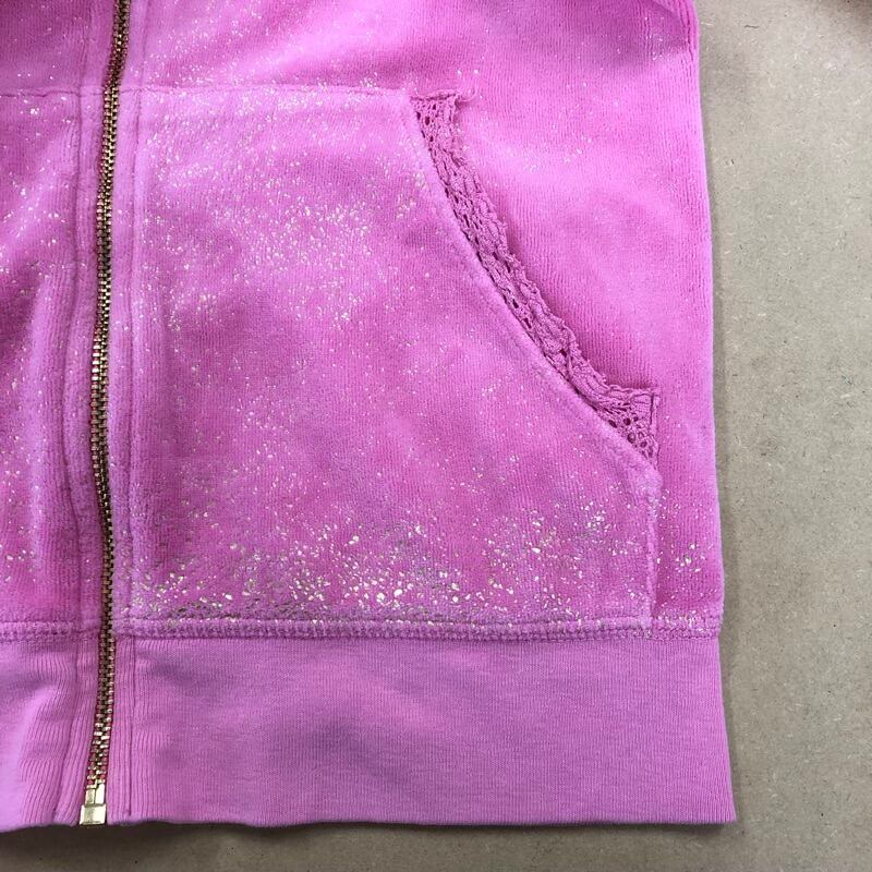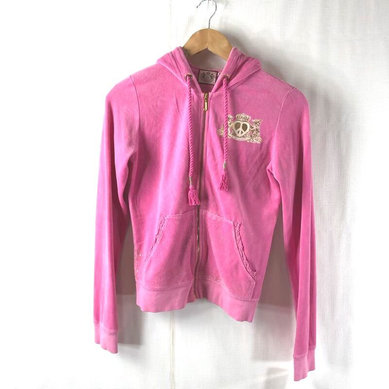 ジューシークチュールボーンインザグラマラスユーエスエー JUICY COUTURE BORN IN THE GLAMOROUS USA パーカー バックプリント フード ジップ レース 綿 ピンク Mサイズ 934673