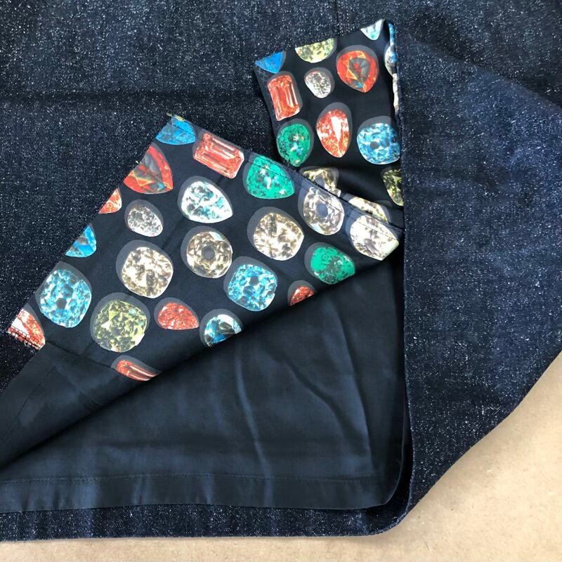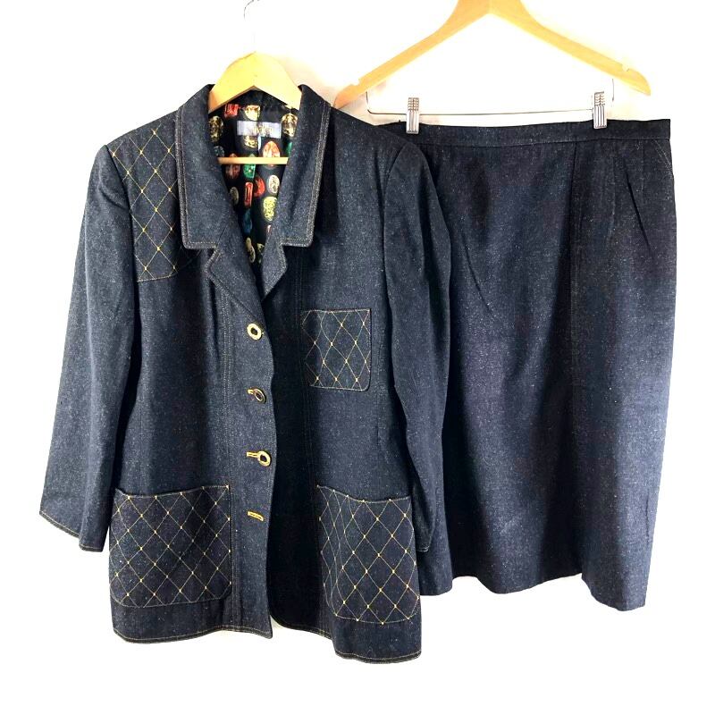 remalon セットアップ ジャケット スカート 裏地柄プリント 金ボタン 袖ボタン サイドポケット ステッチデザイン デニム生地 黒系 973194