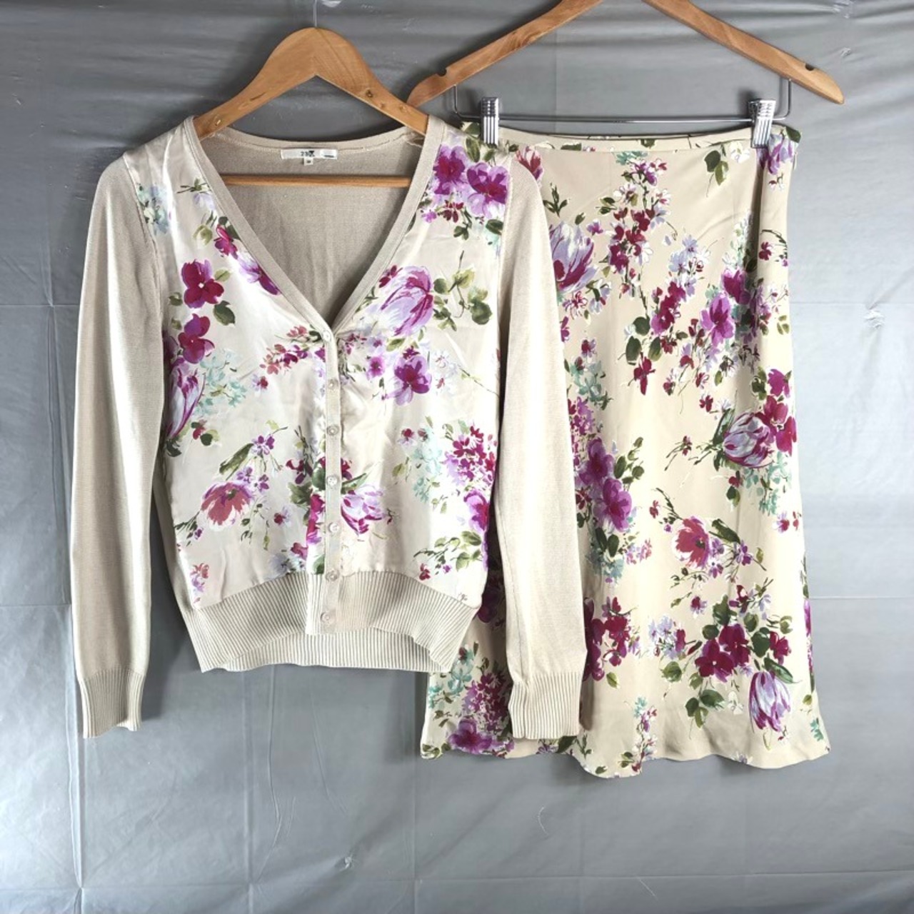ニジュウサンク 23区 セットアップ カーディガン スカート ニット 花柄 リブ シルク 綿 裏地付き ピンク ベージュ系 38サイズ 972923