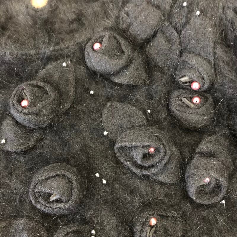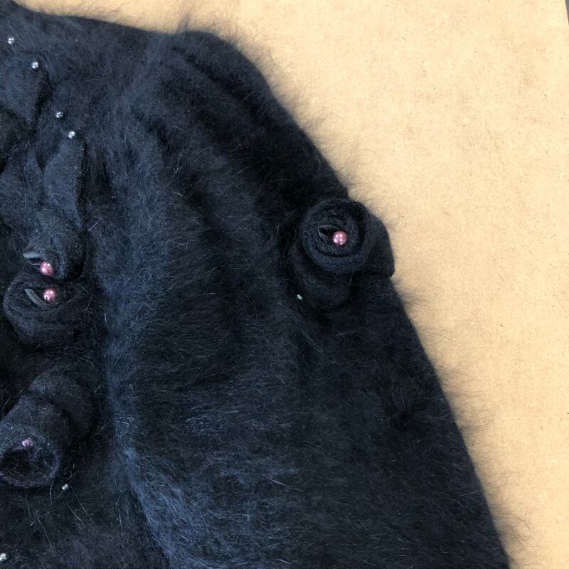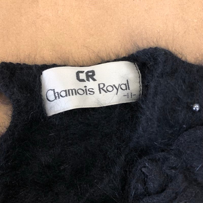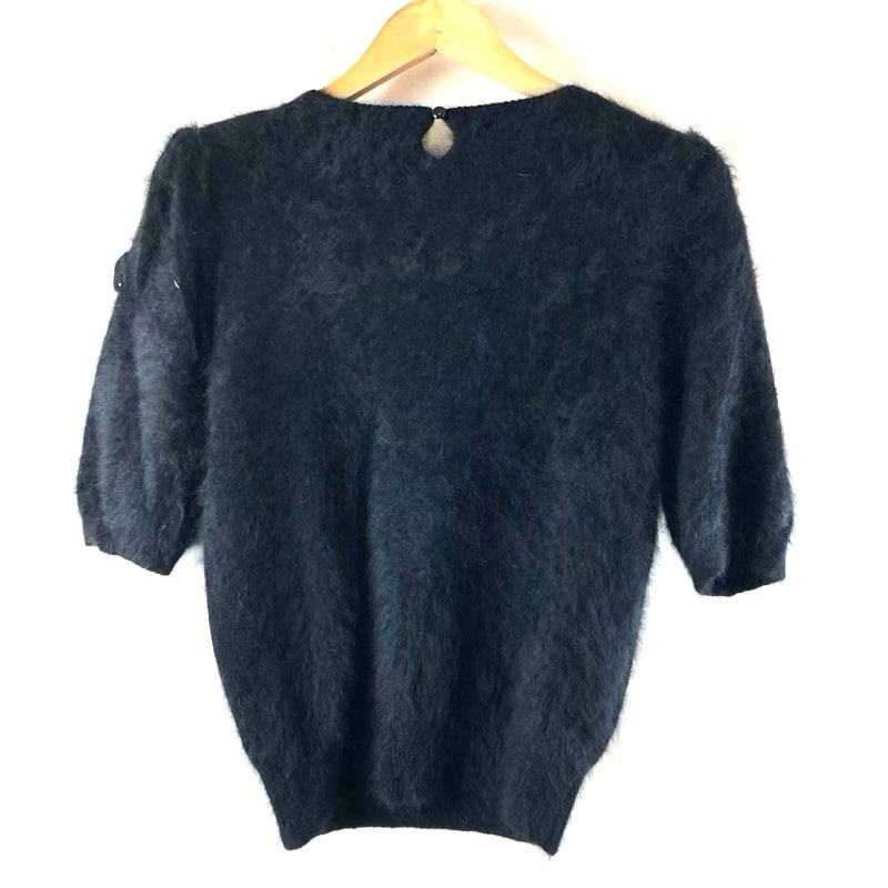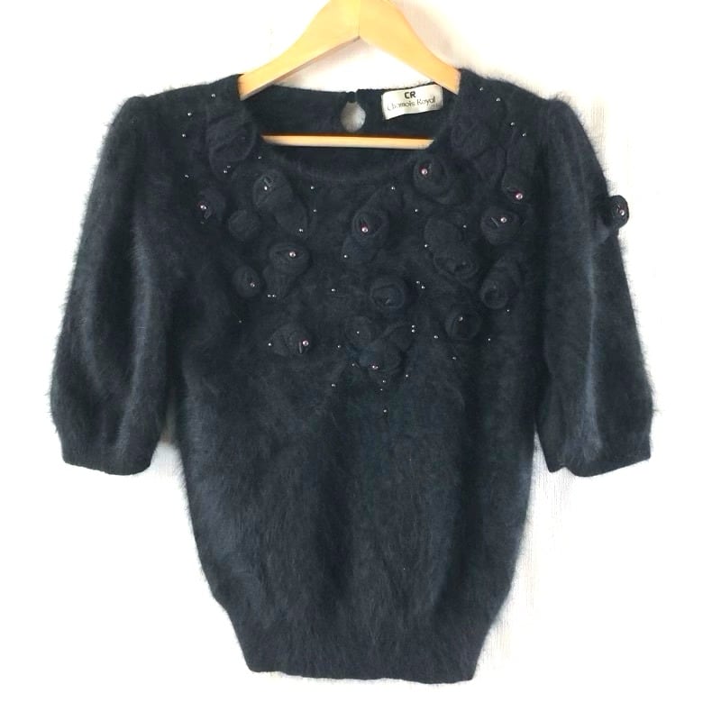 シャミーロイヤル Chamois Royal ニット 半袖 肩パッド付き 花装飾 ビーズ アンゴラ混 ブラック 11サイズ 973127