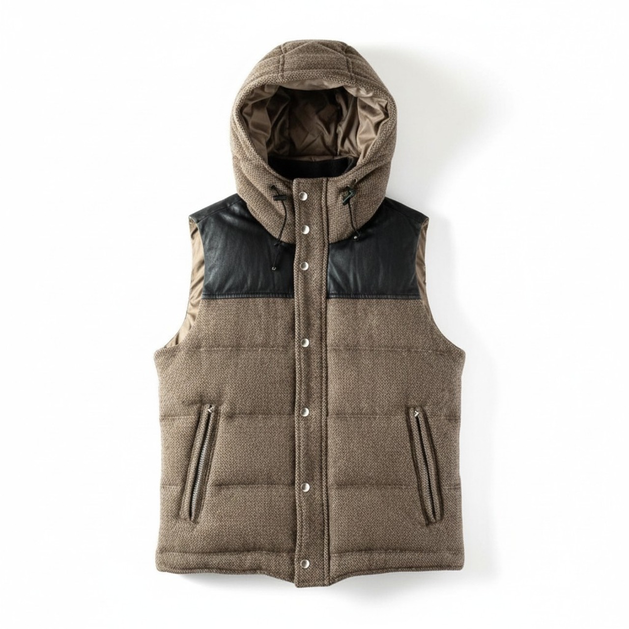 ツイード調の表情が大人っぽい、中綿入りのフード付きベストです。