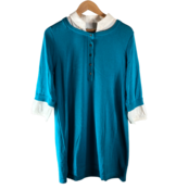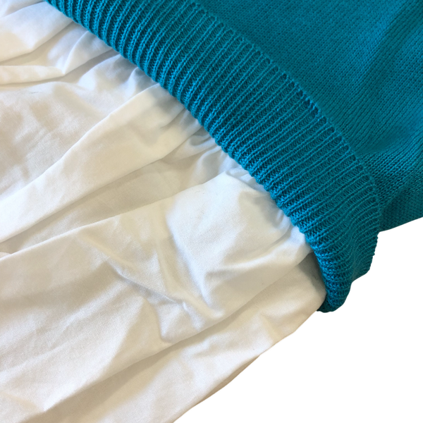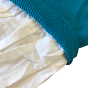 鮮やかなターコイズブルーが目を引く、重ね着風デザインのニットワンピースです。