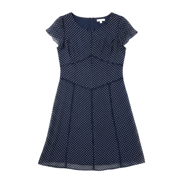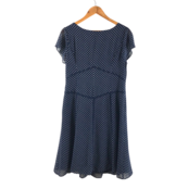 ネイビー地に小さなドット柄が可愛らしく、大人フェミニンに着られるワンピースです。