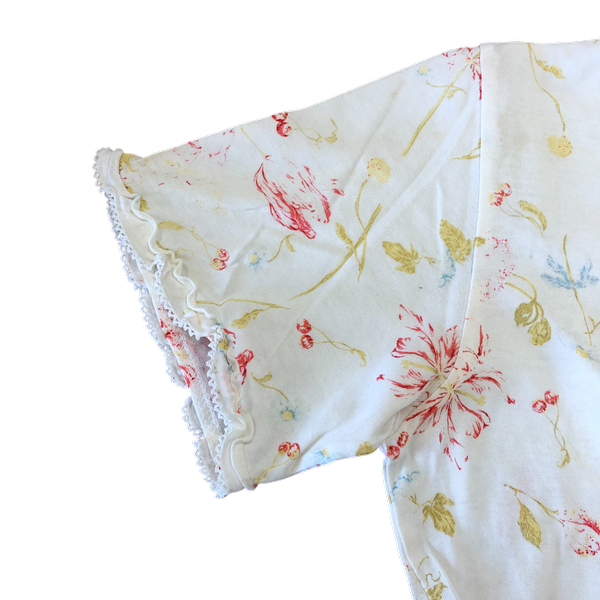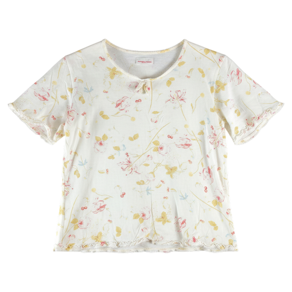 淡い生成りカラーに優しいフラワープリントが広がる、ナチュラルな雰囲気の半袖トップスです。
