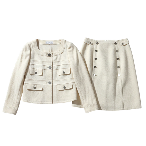 上品なアイボリーカラーが目を惹く、ジャケットとスカートのセットアップです。