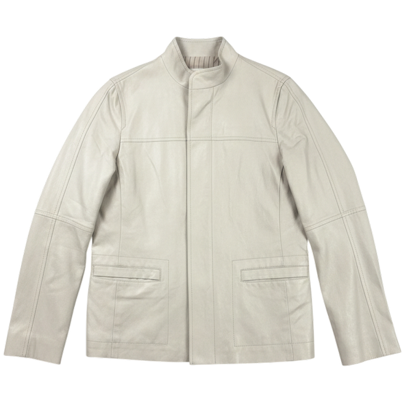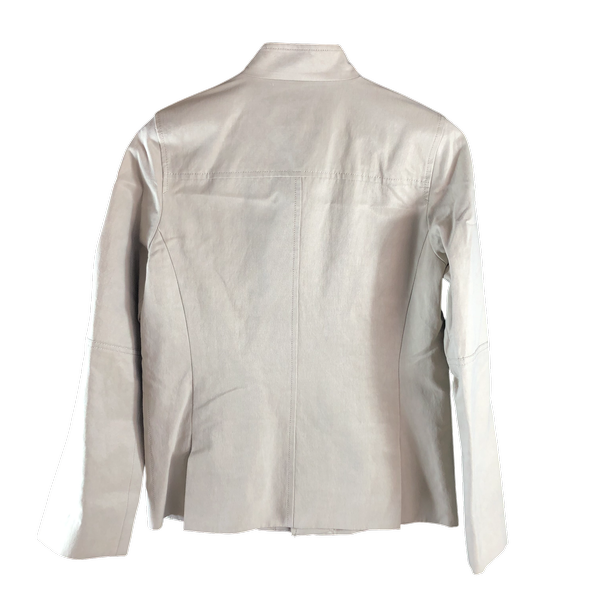 上品なベージュカラーが目を引く、すっきりとしたスタンドカラージャケットです。