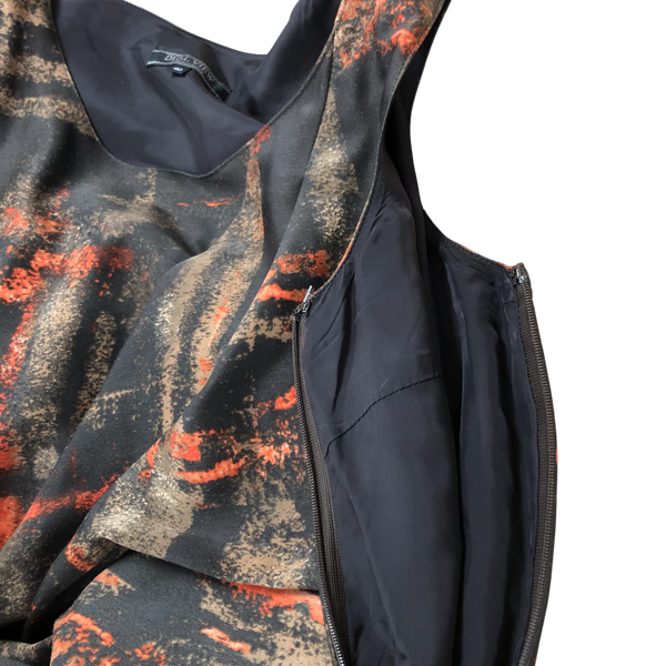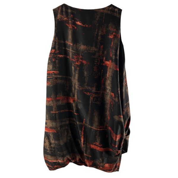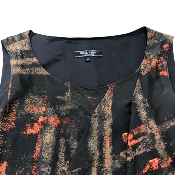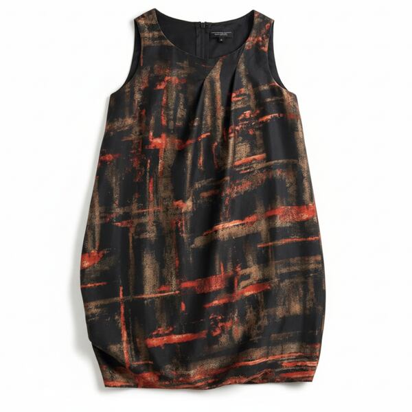 落ち着いた色合いにブラウンや赤みのある柄が映える、アート感たっぷりのノースリーブワンピースですよ。