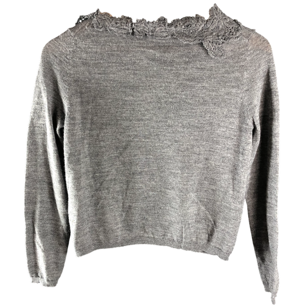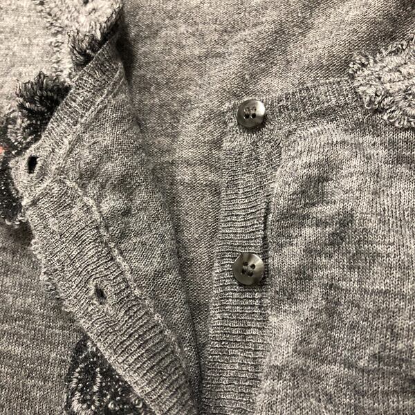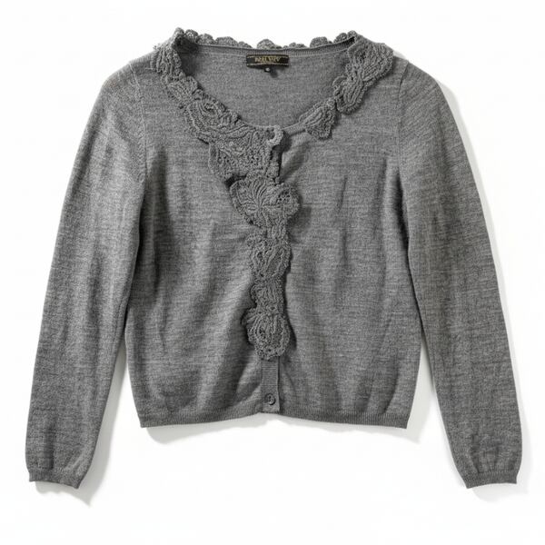 上品なグレーに立体的なレース装飾が映える、女性らしさたっぷりのカーディガンですよ。