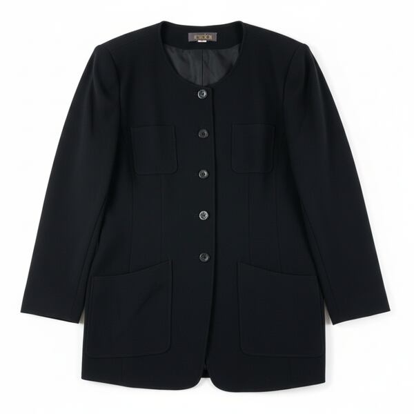 すっきりとしたノーカラーデザインが上品なブラックジャケットです。