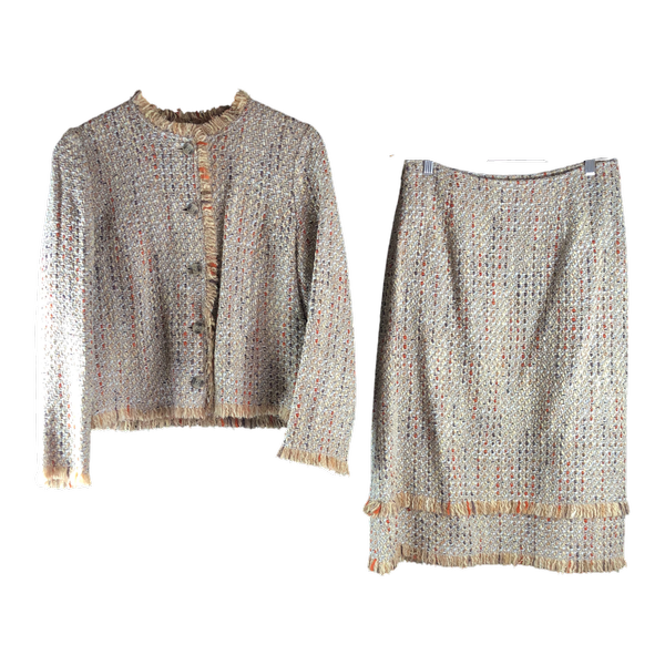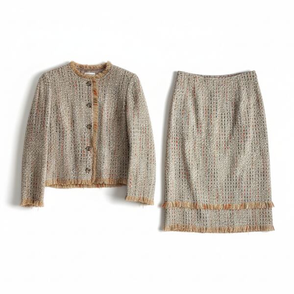 華やかなミックスカラーのツイード素材が目を引く、上品なジャケットとスカートのセットアップです。