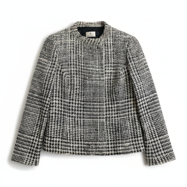 クラシカルなチェック柄が目を引くツイードジャケットで、羽織るだけで上品な雰囲気を演出してくれます。