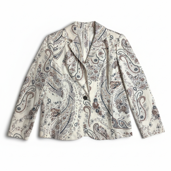 やさしい色合いのペイズリー柄が目を惹く、雰囲気たっぷりのテーラードジャケットです。
