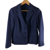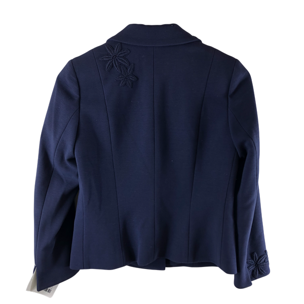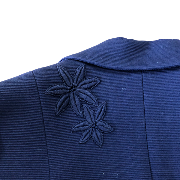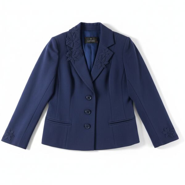 上品なネイビーカラーに立体的なお花刺繍が映える、きちんと感のあるジャケットです。