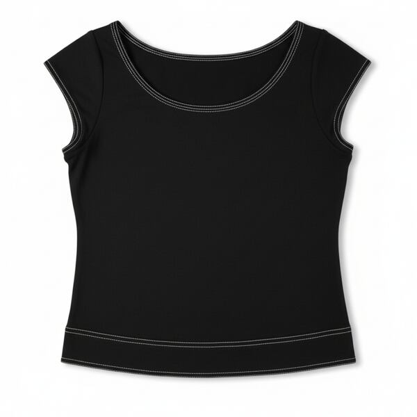 シンプルなブラックに配色ステッチが映える、すっきりとしたノースリーブトップスです。