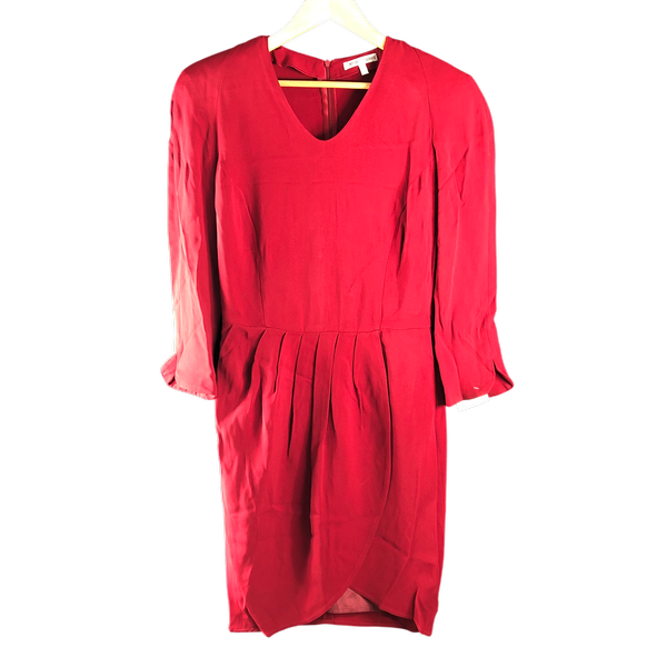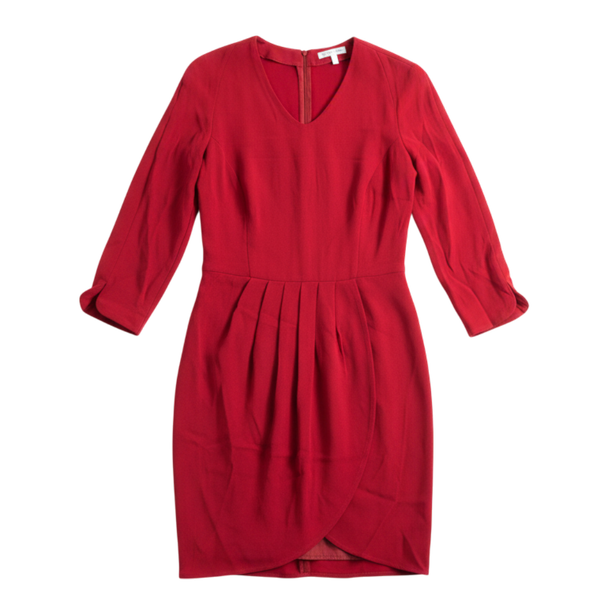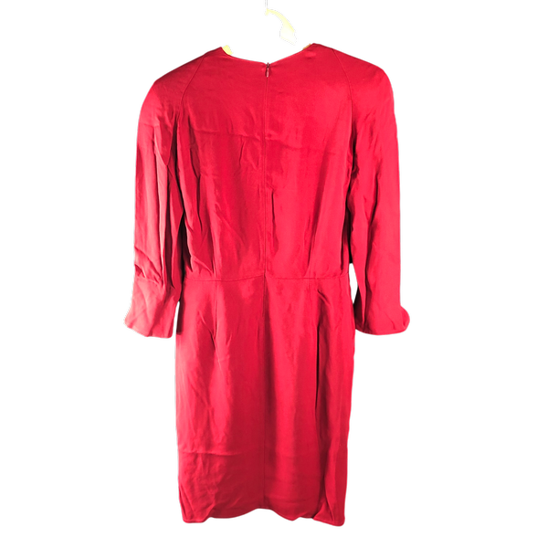深みのある赤がパッと目を引く、上品なVネックデザインのワンピースです。