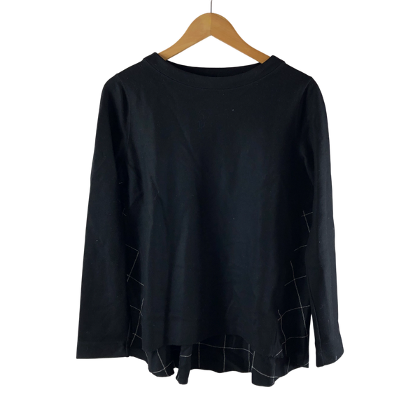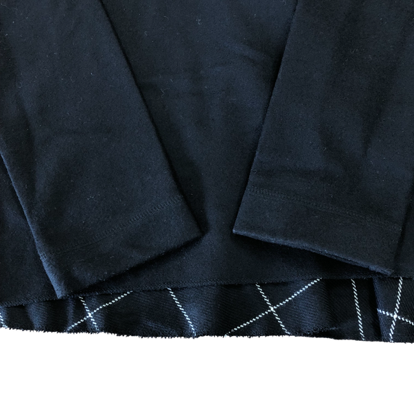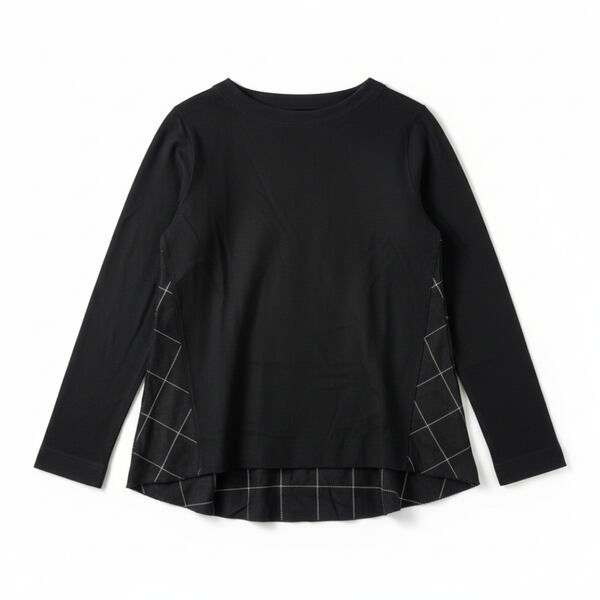 シンプルなブラックトップスに、裾からさりげなくチェック柄が覗くレイヤード風デザインです。