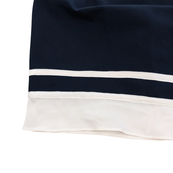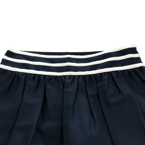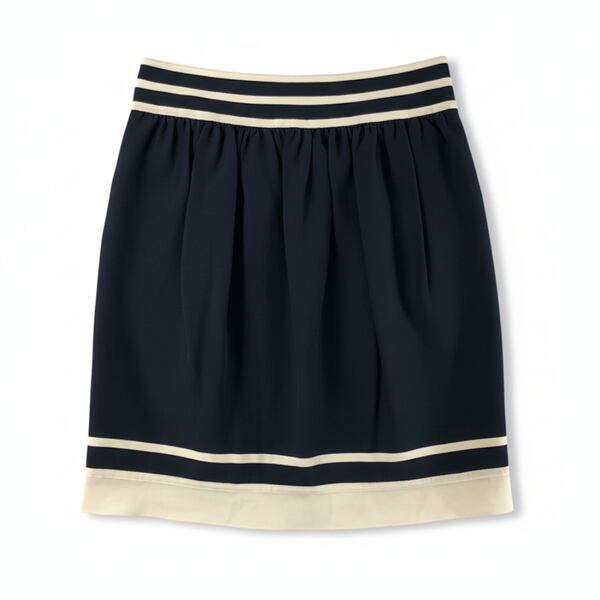 落ち着いたブラックに配色ラインが映える、上品で使いやすいスカートです。