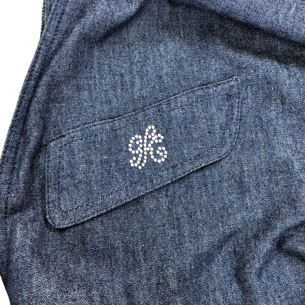 イタリヤ 伊太利屋 カットソー デニム ラインストーン リボンデザイン フェイクポケット スリット 綿100% 日本製 ネイビー系 7A2サイズ 984422