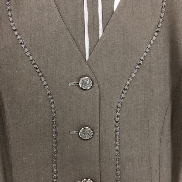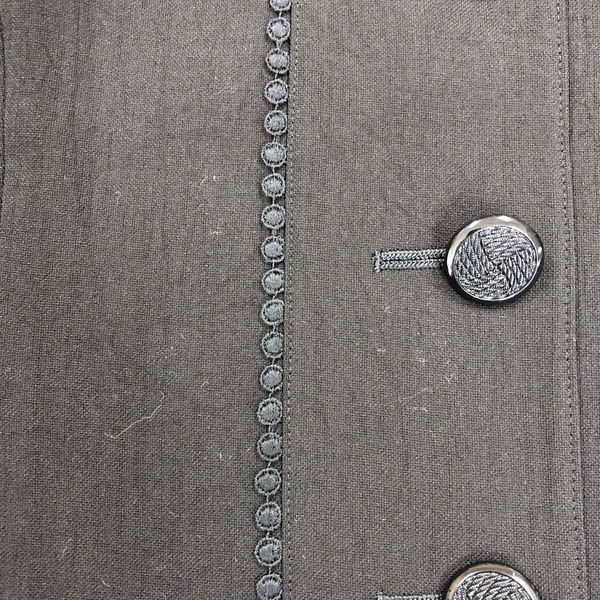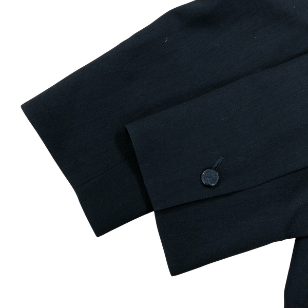 シンプルながら品のあるブラックのノーカラージャケットで、落ち着いた印象に仕上がっています。