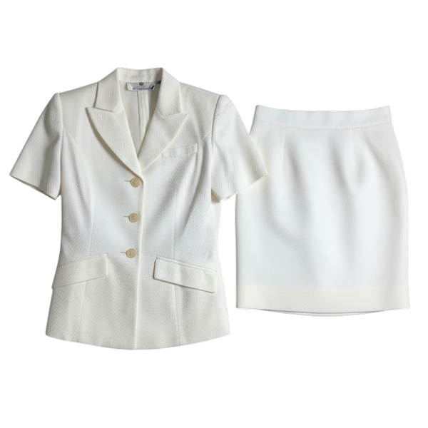 清潔感のあるホワイトカラーが魅力の、半袖ジャケットとスカートの上品なセットアップです。