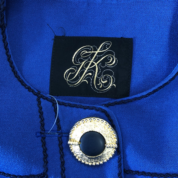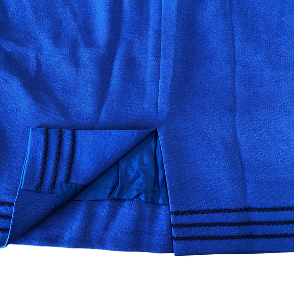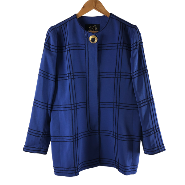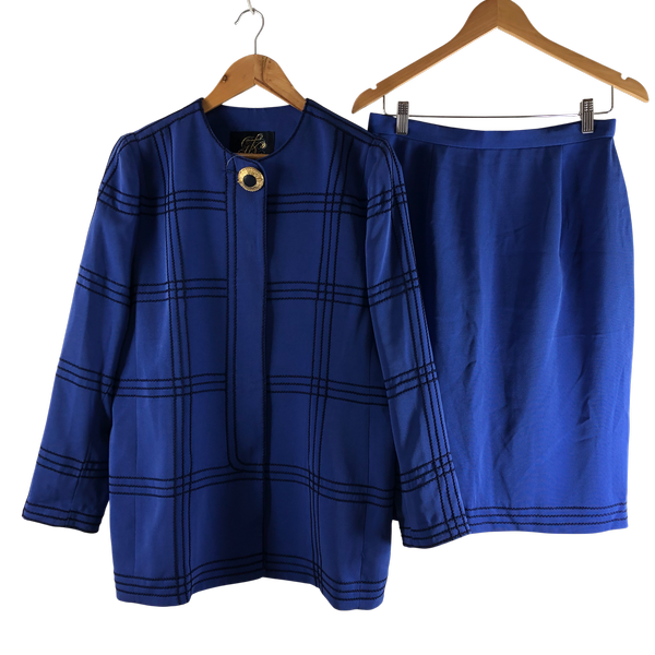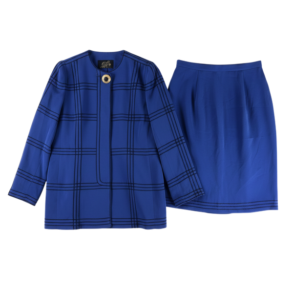 鮮やかなブルーにチェックが映える、上品なジャケットとスカートのセットです。