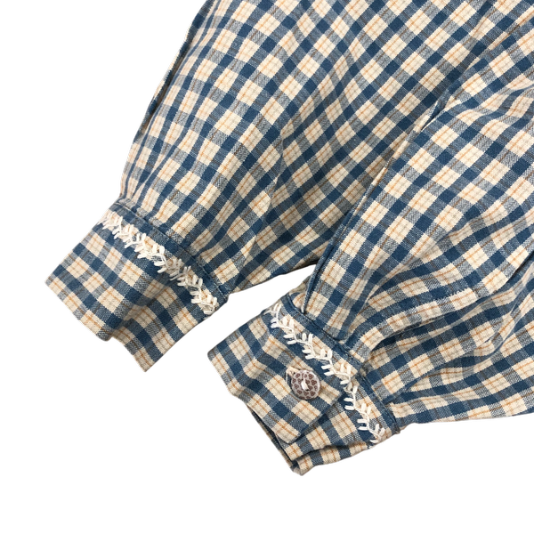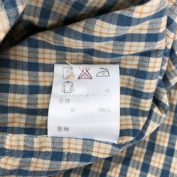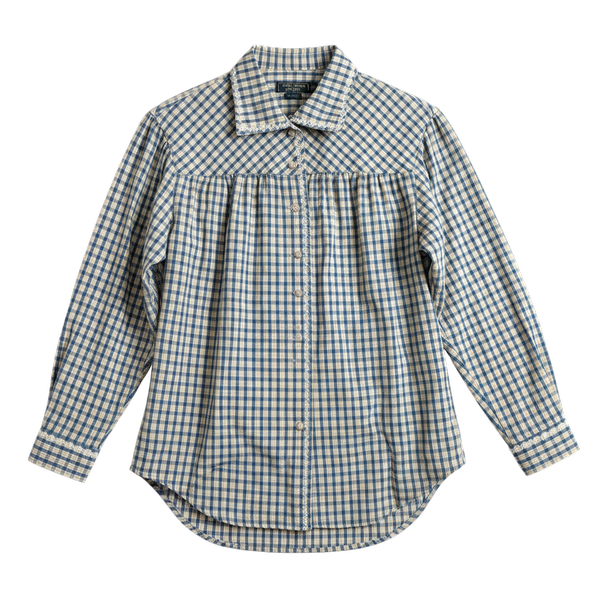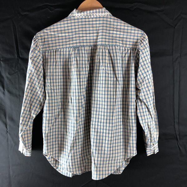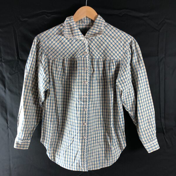 やさしいブルー系のチェック柄が可愛らしいシャツで、着るだけで雰囲気の出る一枚ですよ。