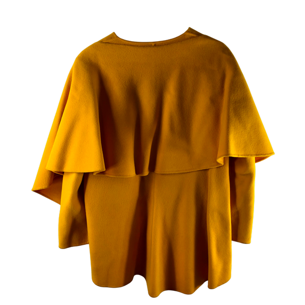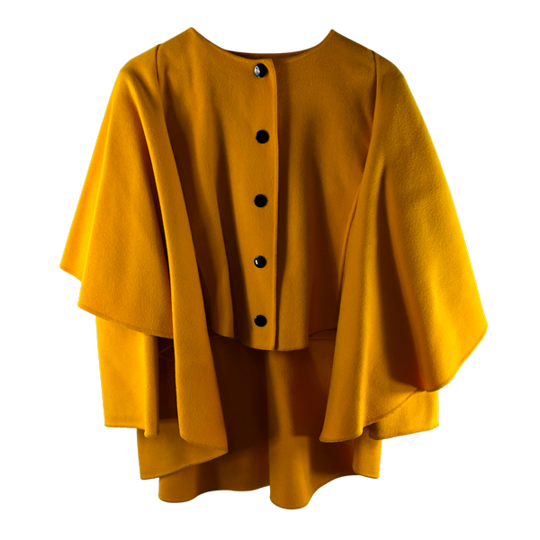 目を惹くマスタードカラーがコーデの主役になる、存在感たっぷりのケープ風アウターです。