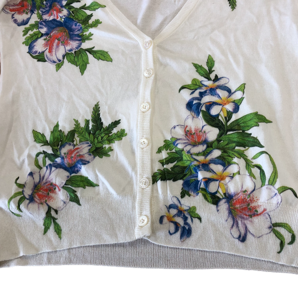 やさしいホワイトベースに華やかなフラワープリントが映える、着るだけで気分が上がるカーディガンです。