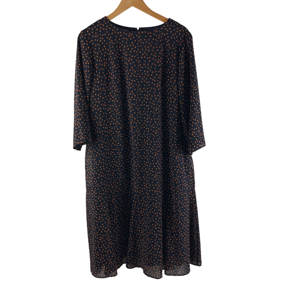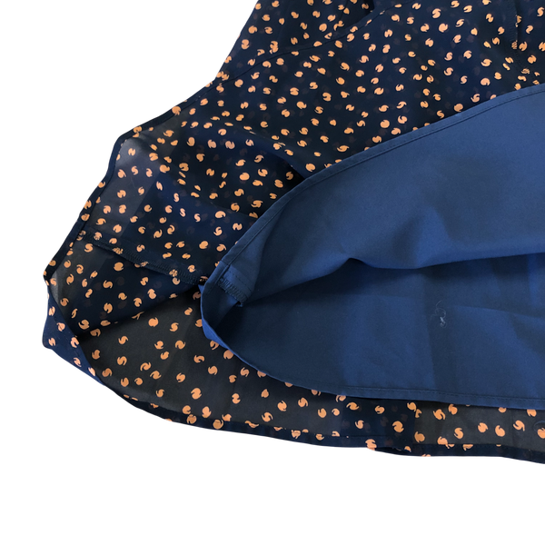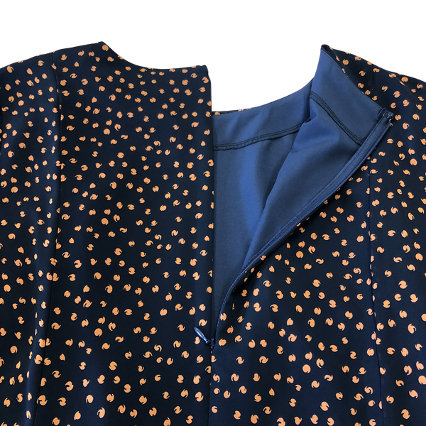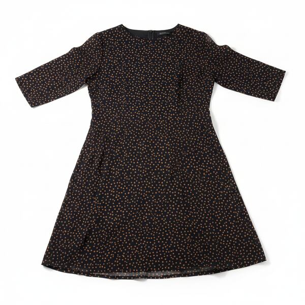 落ち着いたネイビーベースに小さなオレンジドットが散りばめられた、大人可愛いワンピースが入荷しました。