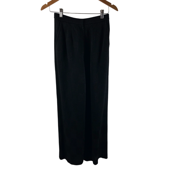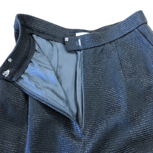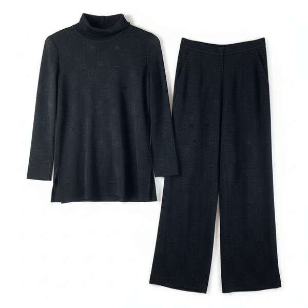 さりげない織り柄が上品な、ブラックカラーのトップスとパンツのセットアップです。