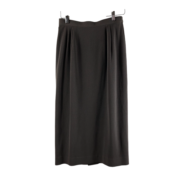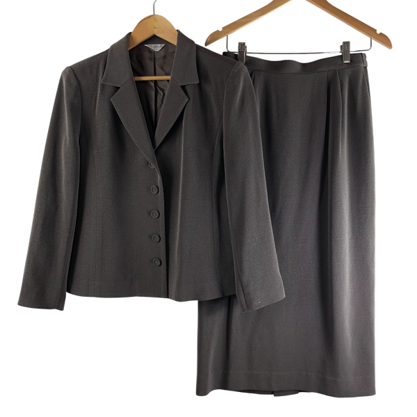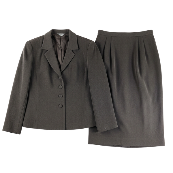落ち着いたカーキグレー系のジャケットとスカートのセットアップで、きちんと感と女性らしさを両立してくれます。