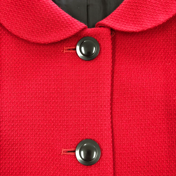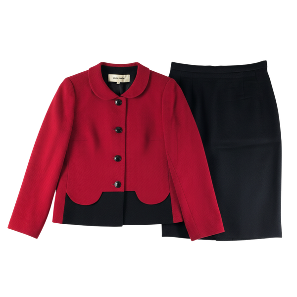 鮮やかな赤のジャケットにブラックスカートを合わせた、コーディネートが一気に華やぐ上品なセットアップです。